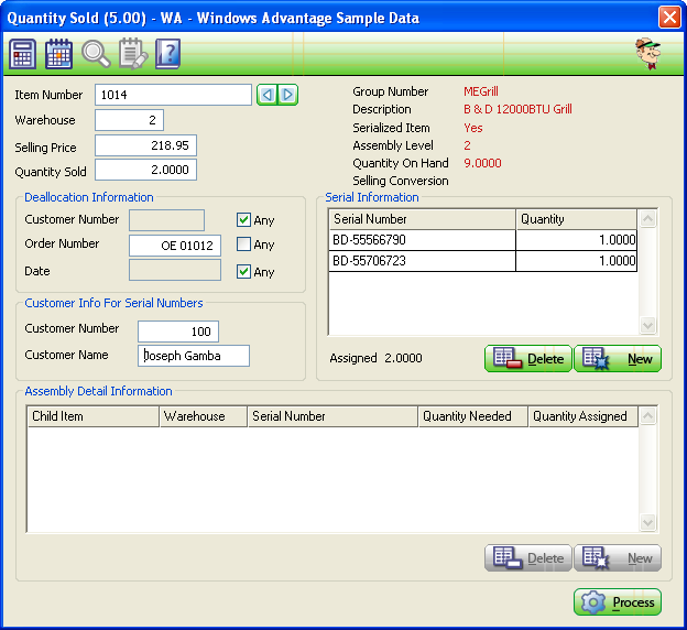 Although this program should rarely be used (your sales should be processed through sales modules) we nonetheless gave the Inventory Quantity Sold program a major facelift. As with Items Produced program, you have the new deallocation options, and we've added a table where you can add a list of serial numbers that you're selling (rather than one at a time as in the DOS version).